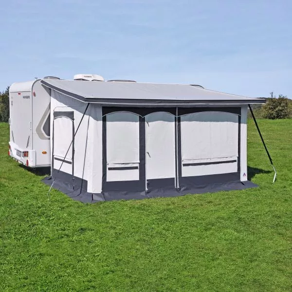 Das Hahn Vorzelt Friesland ist mit seinem robustem PVC-Material ideal als Wintervorzelt bzw. Ganzjahresvorzelt geeignet. Das Vorzelt wird in dieser Ausführung links im Keder eingezogen.